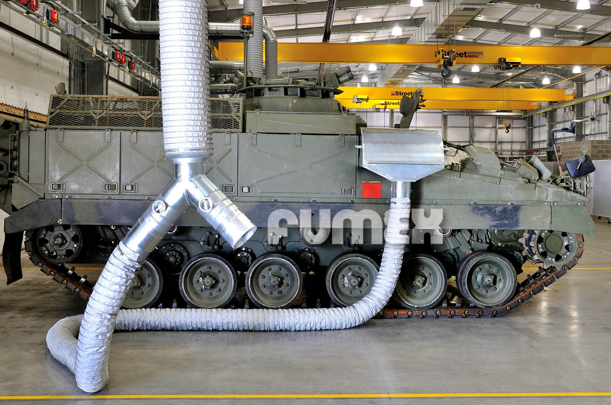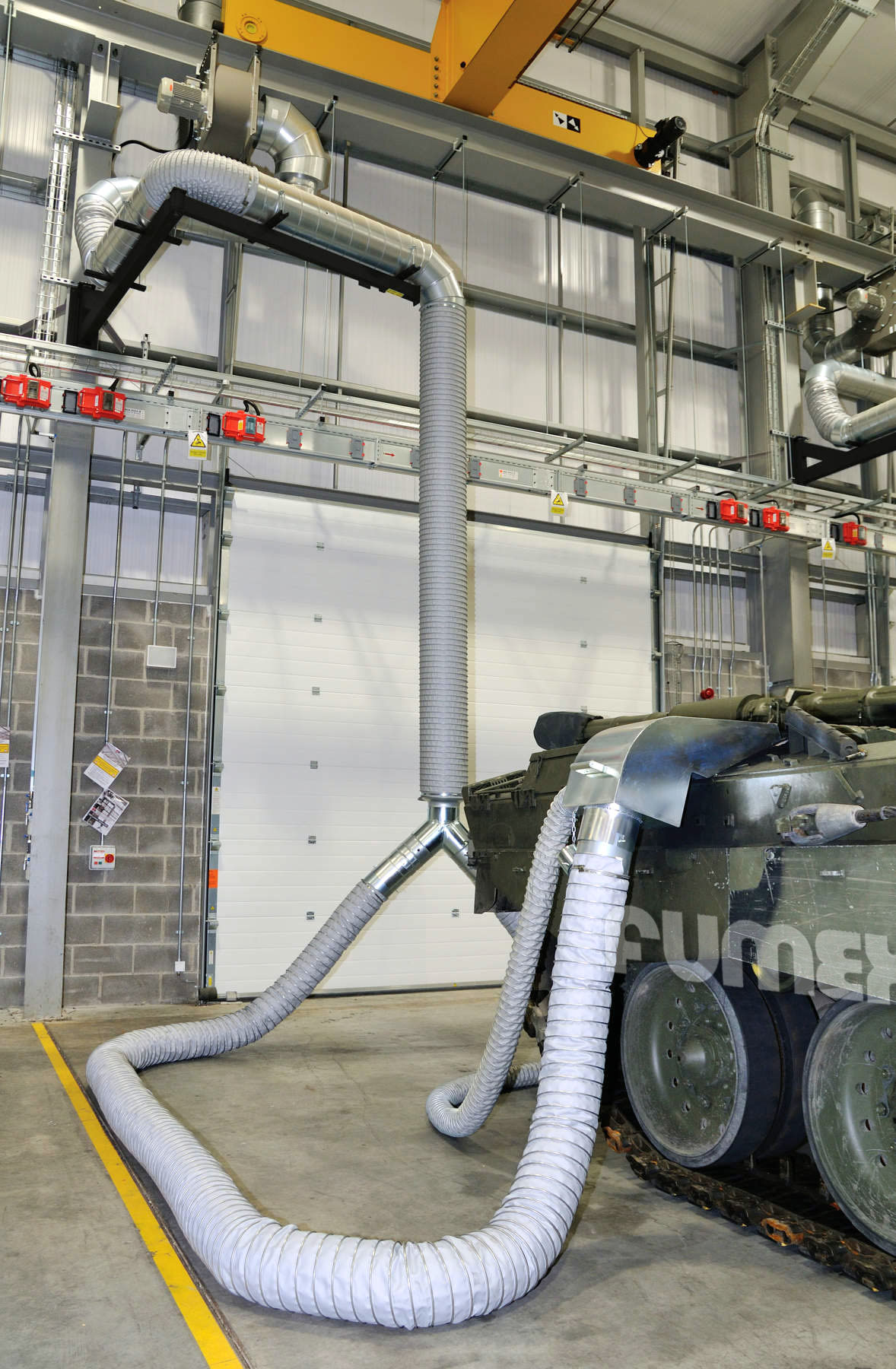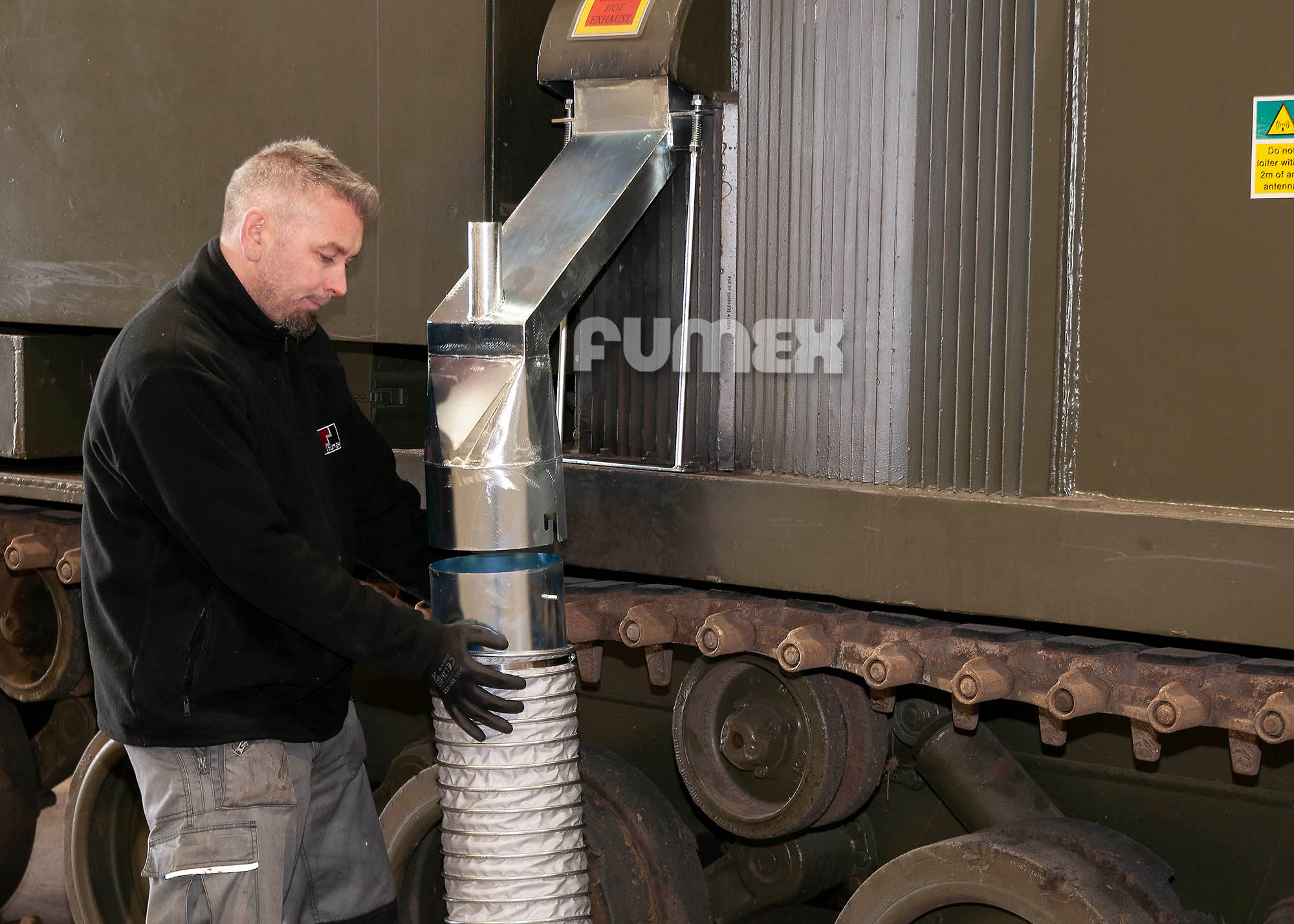 The dangers of breathing in heavy diesel fumes produced by large engines when maintaining and servicing are all too obvious. Working closely with our MoD Partners, Fumex Ltd have developed a range of custom designed, hand crafted exhaust fume hoods for all types of military vehicles.