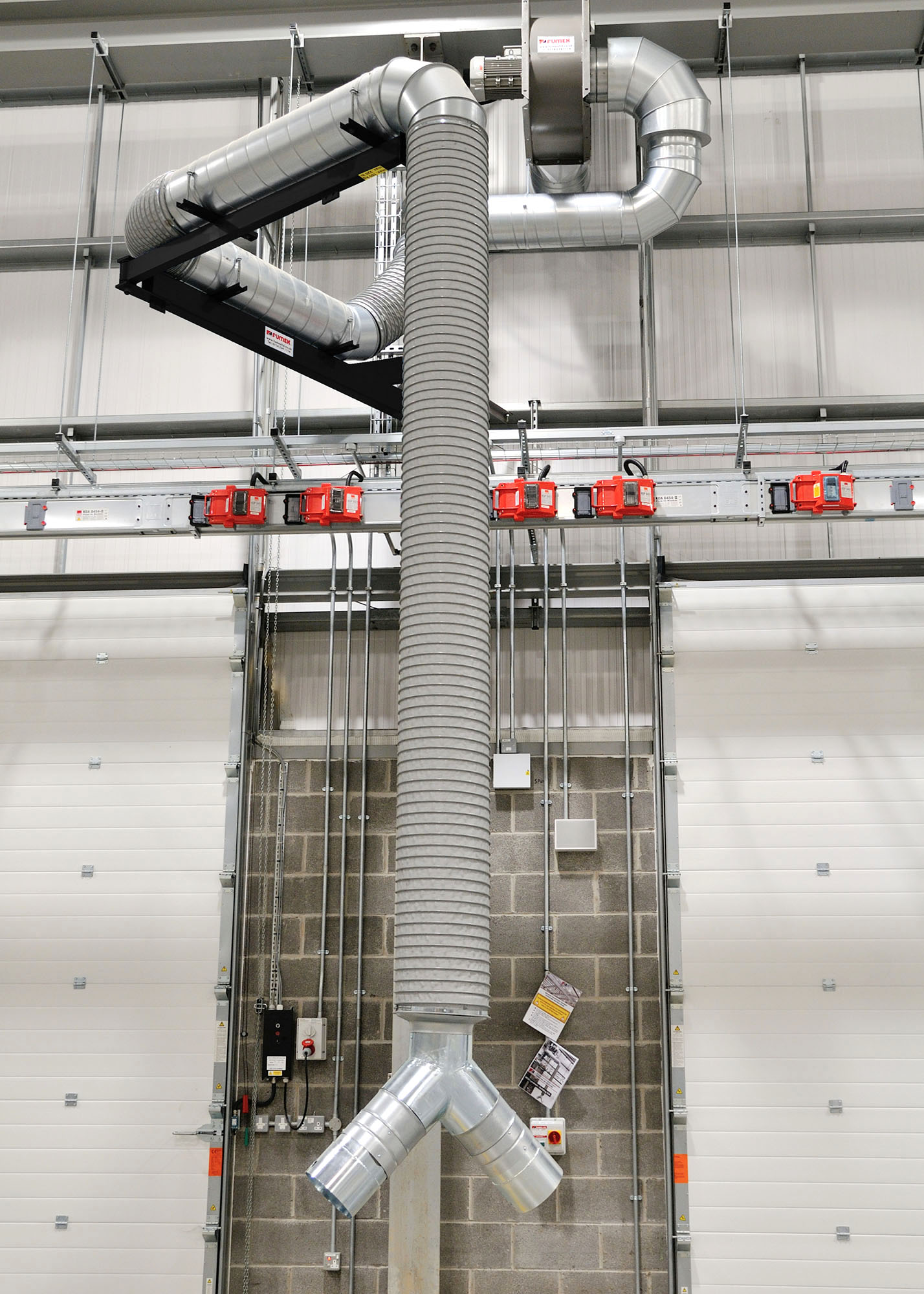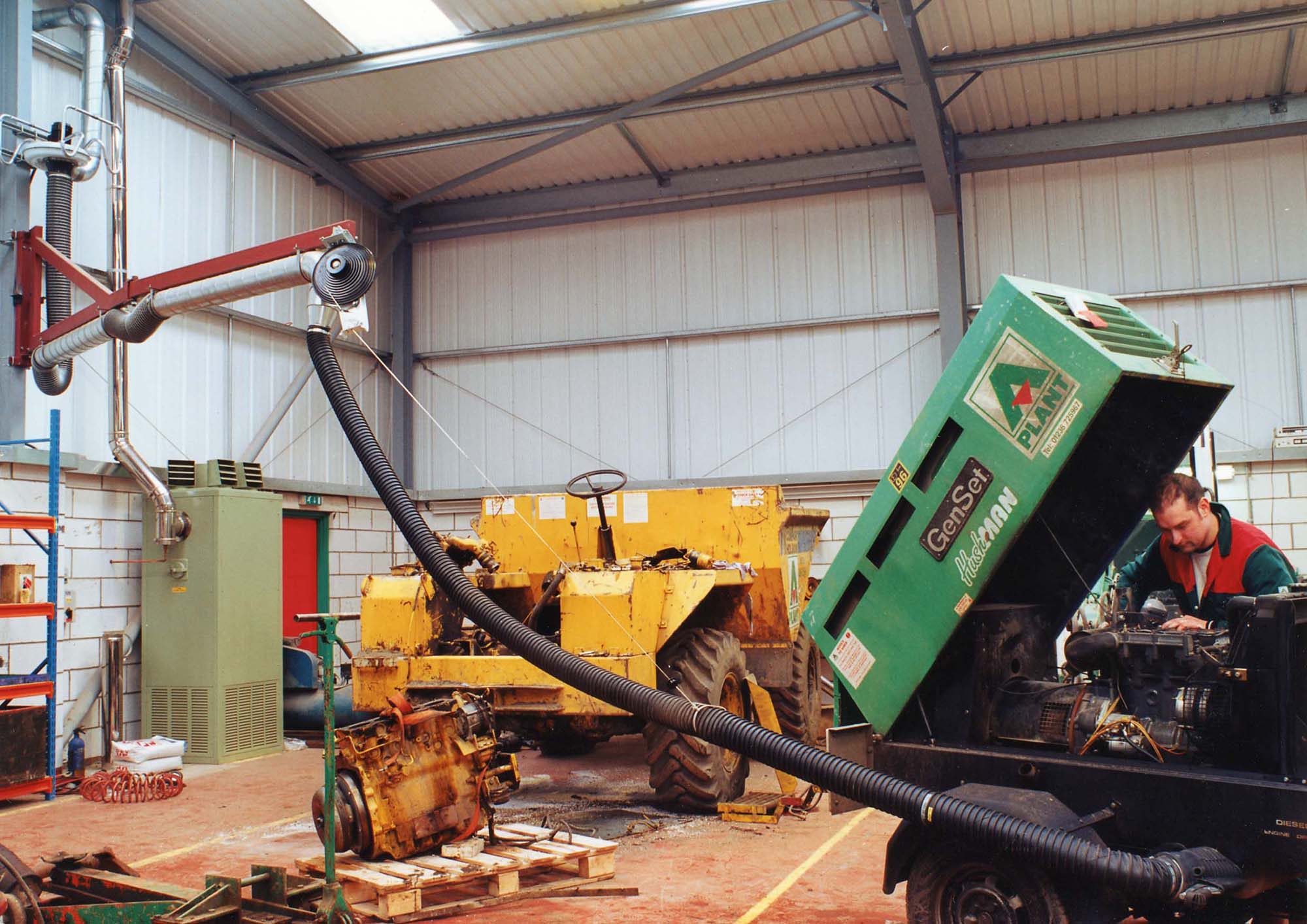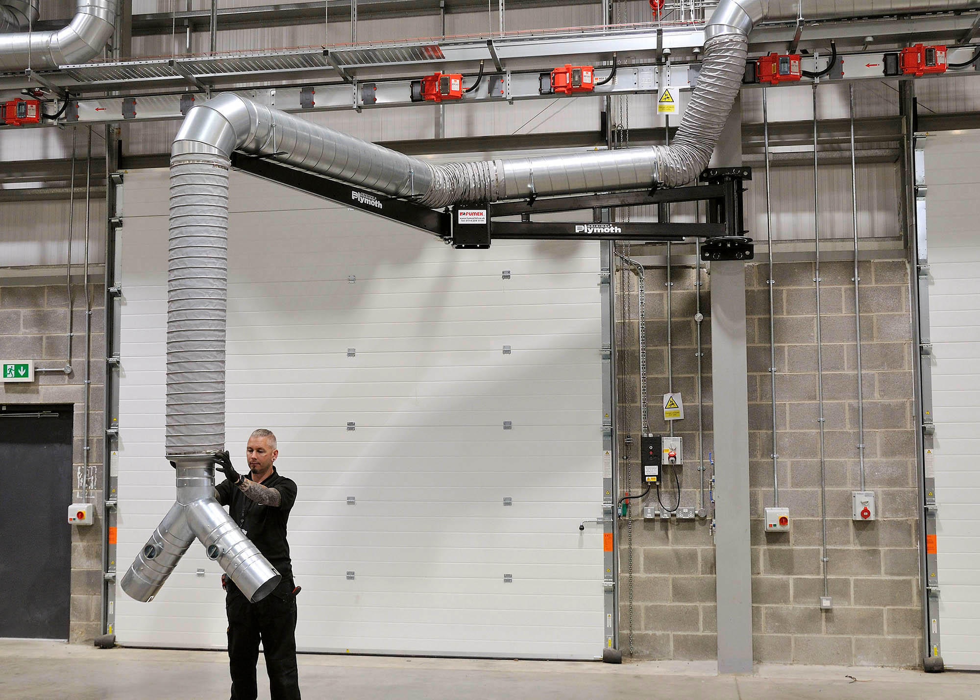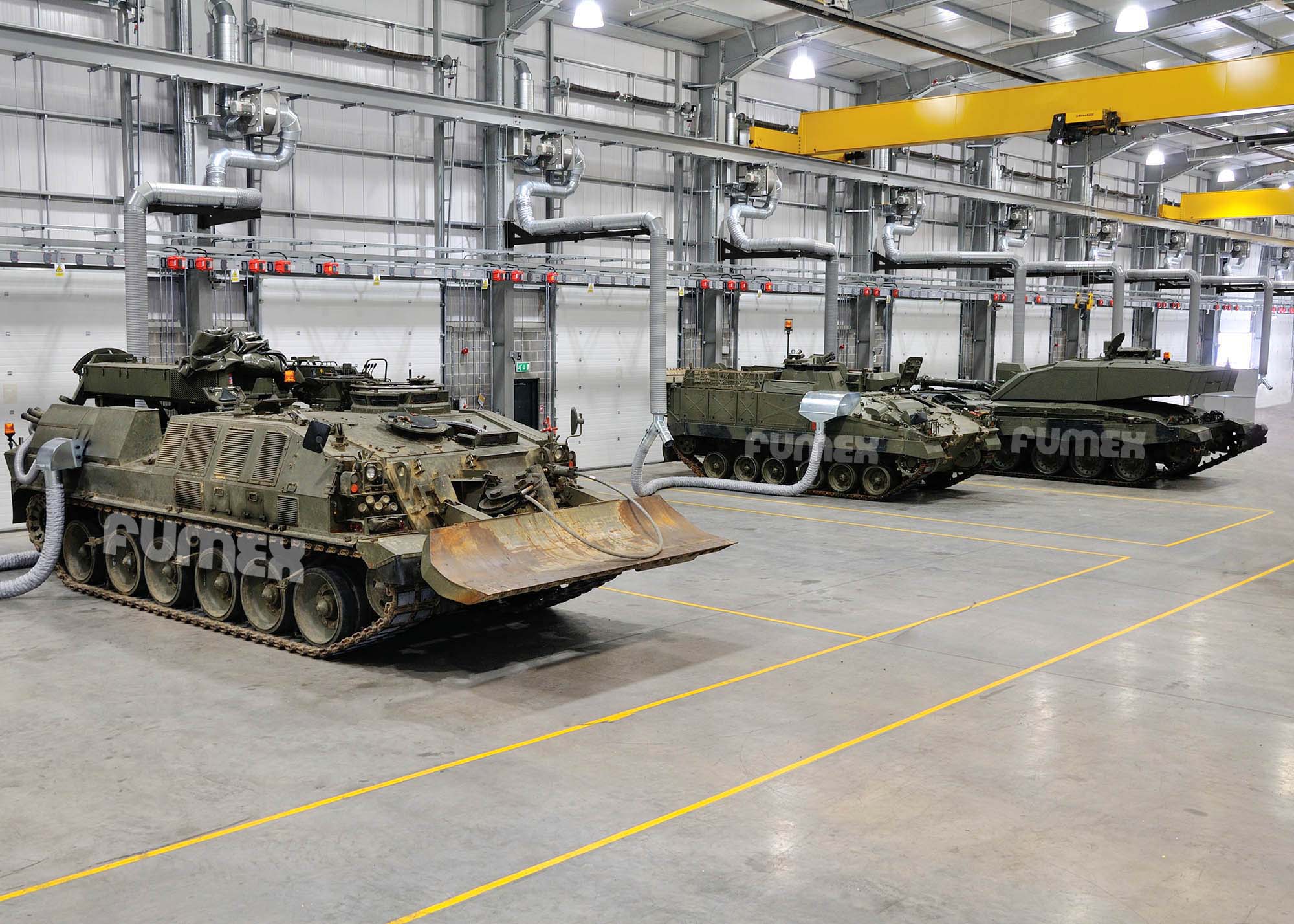 Fumex Ltd supply and install a wide range of Boom Arms and Articulated Boom Arms for many different applications. The advantage of a boom arm is that they can cover a large area of a work bay yet are easily retracted when not in use. From the smallest generator to the largest military vehicle, boom arms will capture at source all exhaust gases and vent them safely to atmosphere via a Jet-Cowl.