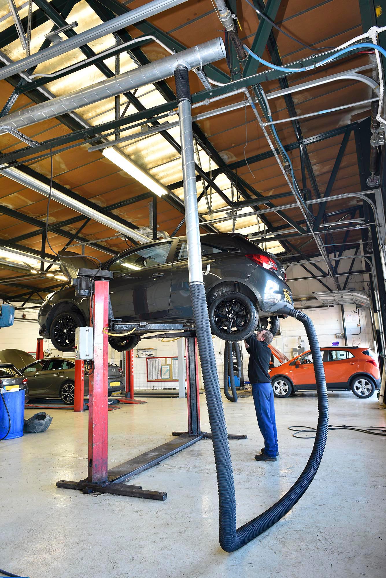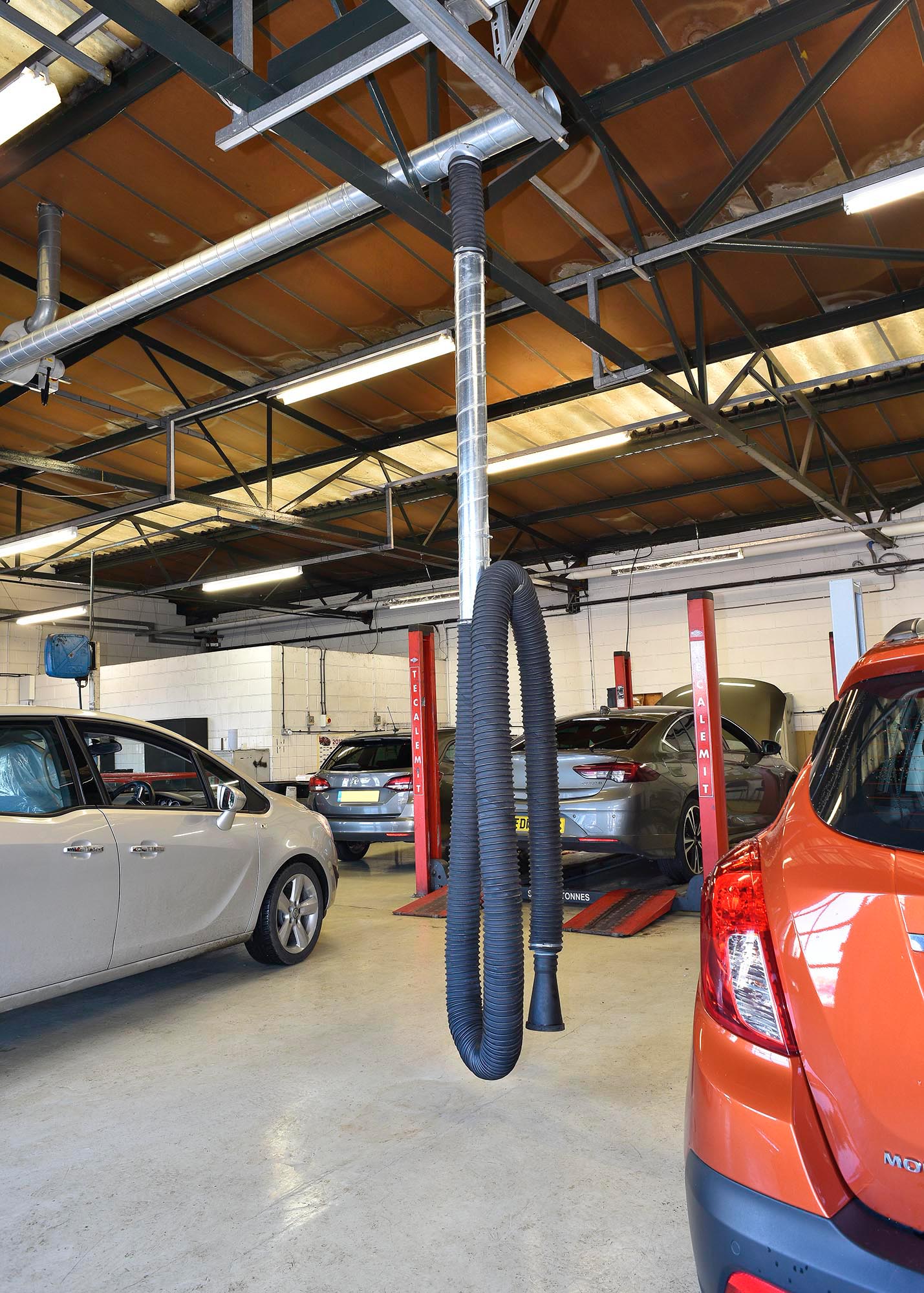 The system comprises of high-quality galvanised steel ducting, this can be attached directly to the workshop wall (Fixed System) or with flexible hose drops (Semi-Flexible System). From the ducting, our high temperature extraction hose is fitted, this allows the system to be connected to the vehicle via one of our wide range of rubber or steel exhaust nozzles. After use, simply disconnect the exhaust nozzle and return the hose to the storage bracket provided.