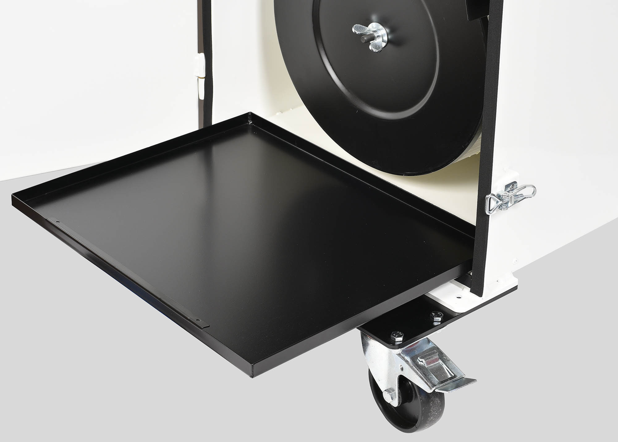 Our unit is equipped with many features, such as a built-in welding gun holder, a connection for the earth cable from the welding machine, overhead light, removable grids for easy cleaning and lockable front castors.