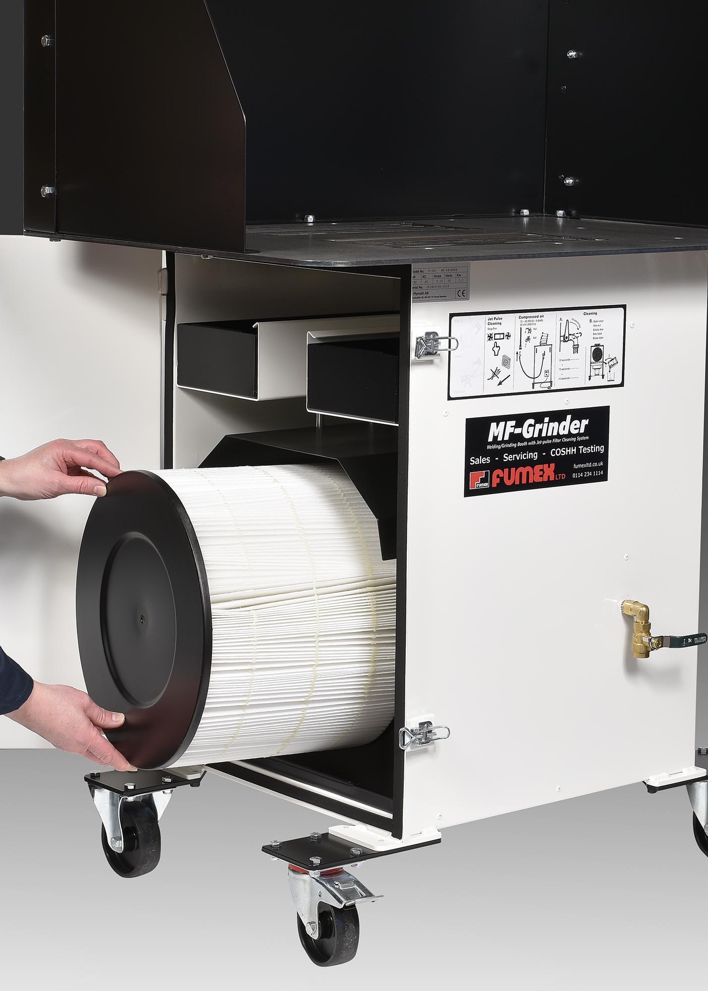 The Jet-pulse filter cleaning system is designed to quickly and efficiently clean the internal cartridge filter (when connected to compressed air supply) via the hose supplied. Fumex Ltd recommend emptying the dust tray before and after the cleaning process to maximise the cleaning efficiency.