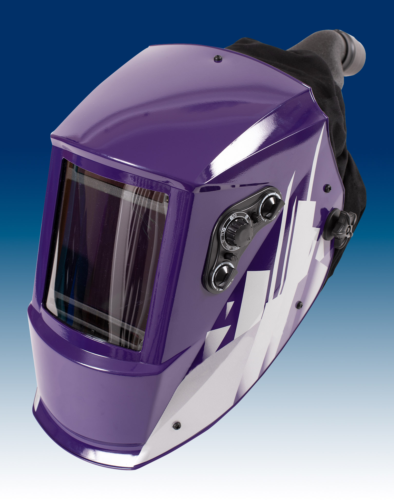 The helmet features an extra-large viewing area, true colour lens, four arc sensors, variable shade control DIN 5-9/9-13, ADF self-testing, dual solar cells and UV/IR protection.